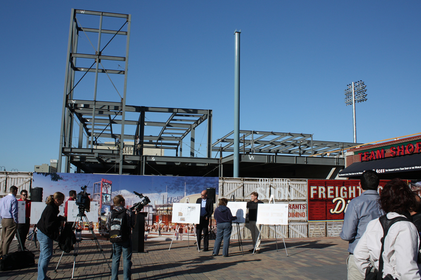 -The basic plan is four restaurants and a sports bar that overlooks the ballpark. The sports Bar is perched above the entrance while the restaurants will be located where the new steel frame is going up. As soon as I get digital versions of these renderings I'll throw them up, but for now here are some shots of the plans. I am including ultra-high resolution 12 megapixel pictures for this one, so those of you who wish can really zoom in on the details and see the plans. You can access the high resolution photos by first clicking the small thumbnails to get the larger image that pops up, then by clicking on the larger image that pops up, you'll get the high res version. Enjoy!