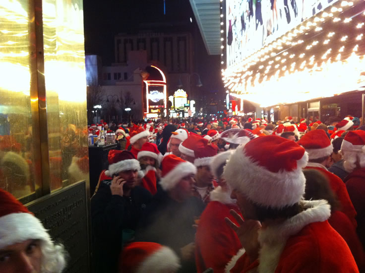 This year's Santa Crawl in downtown Reno was fifty times better than last years, for numerous reasons. For one, the event promoters learned from the urine-drenched alleys of last year and placed high-end porta-potties around downtown, which made a world of difference. The problem of lack of restrooms was fixed this year.