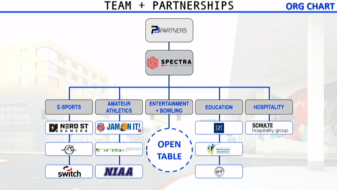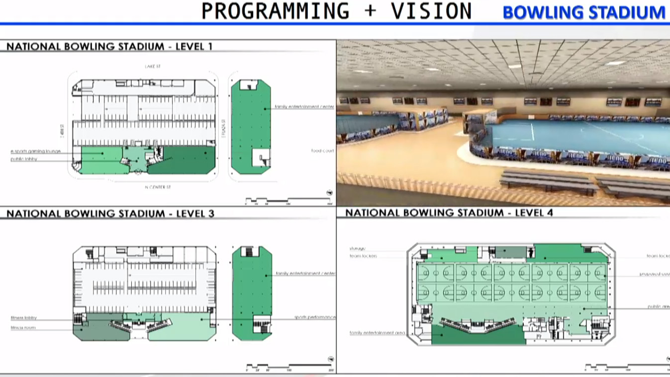 The second component is the bowling stadium. They would assume management of the bowling stadium through Spectra, a national venue management company whose experience is outlined in the slide deck below. The plan for this building is to keep bowling, and add additional sports facilities within the building, perhaps basketball courts or other modular venues. In addition, P3 discussed an adventure park south of Plaza Street in the unused open area of the bowling stadium, a kids zone, and a high-end gaming lounge (video games, not slots).