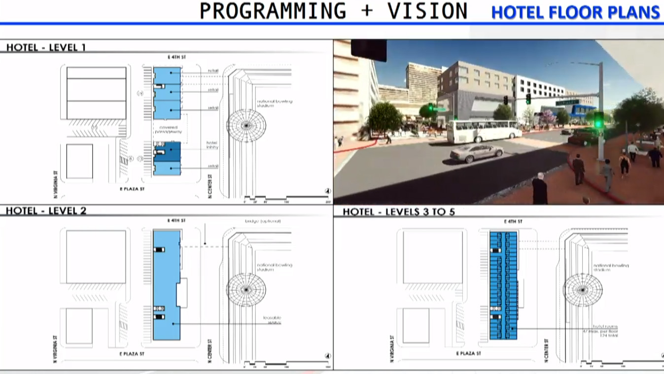 The first component is a five-story retail, office and hotel venue on the former CitiCenter bus station site on the corner of 4th Street and Center Street. This component would include retail on the first level with expansive sidewalk seating, offices on the second floor, and a hotel on levels three through five.