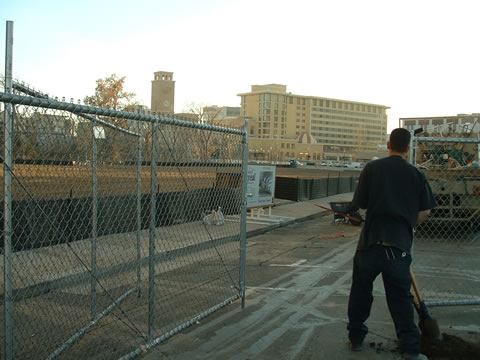 Both sides of First Street have more permanent fencing barriers blocking it off.